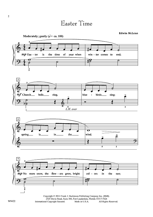 Moving between major and mixolydian mode, this artistic piece sounds as fresh as the lyrics about the change in seasons. Eighth notes, accidentals, hand-crossings, and use of pedal are sprinkled freely throughout, yet it’s still accessible to the late elementary student.