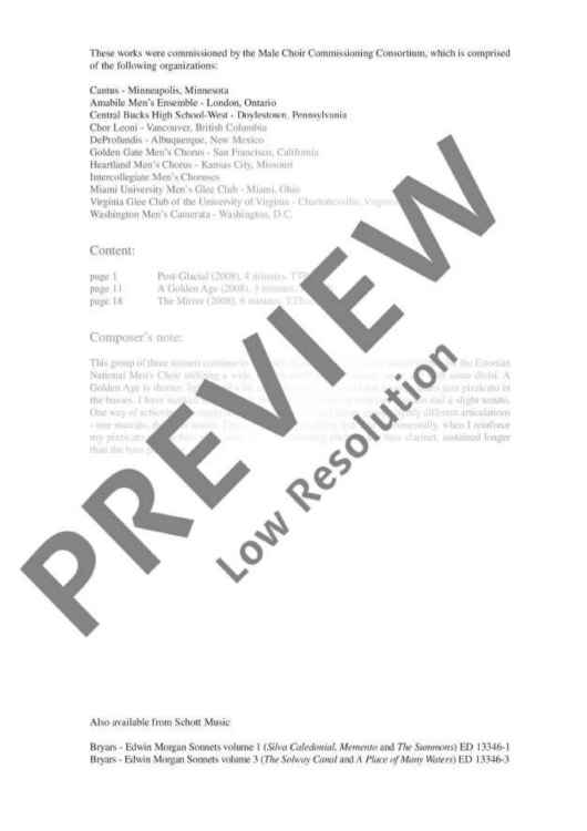 The works in these three volumes for eight-part male choir are settings of sonnets by late Scottish Poet Laureate, Edwin Morgan (1920-2010). An admirer of Morgan's virtuosic poetry, Bryars wrote Silva Caledonia for the Estonian National Men's Choir in 2006, eventually adding seven more settings, including two derived from his Piano Concerto. A great collection for any ambitious male choir.