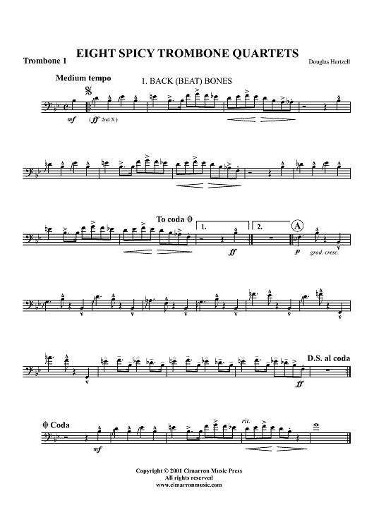 Digital Sheet Music for Eight Spicy Trombone Quartets - Trombone 1 by Douglas Hartzell scored for Trombone Quartet; id:319715