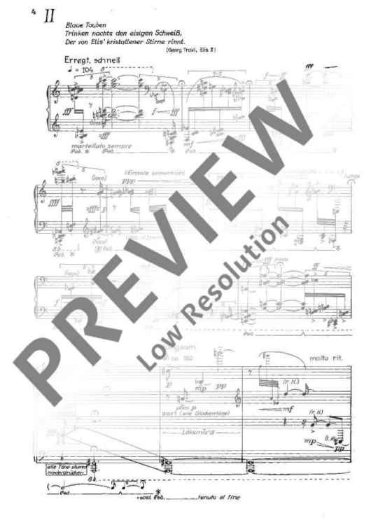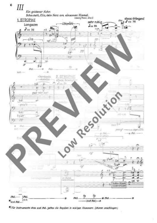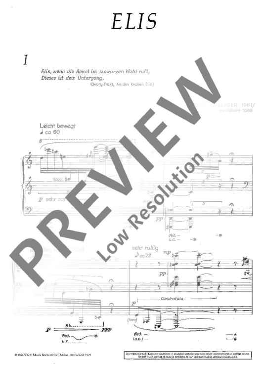 …für Klavier sind 1961 entstanden. Jürg Wyttenbach hat sie im Januar 1962 in Basel uraufgeführt. Obschon die drei Stücke (über Gedichte von Georg Trakl) ganz aus den spezifischen Eigenarten des klavierklangs heraus entstanden sind, habe ich 1963 versucht (quasi als Vorarbeit zu meinen szenischen Projekt „Der magische Tänzer“ 1963/65) diese „Elis“-Musik aufs Orchester zu übertragen. Besonders wichtig schien mir dabei, neben einer möglichst differenzierten Organisation der Klangfarben vor allem die in der Klavierfassung sehr wesentlichen Pedal-Resonanzen auszukomponieren. Die Orchesterfassung. Die Orchesterfassung hat Pierre Boulez 1964 mit dem Stockholmer Radioorchester uraufgeführt. 1973 habe ich den 1966 neu komponierten Anfang des 2. Nachtstückes ebenfalls orchestriert und vor allem die (durch die Verwendung indischer Rhythmen bedingte) metrische Gliederung der drei Stücke zu vereinfachen versucht. Den Stücken sind Motto folgende Verse aus Georg Trakls „Elis“-Gedichten vorangestellt: I. „Elis, wenn die Amsel im Schwarzen Walde ruft, Dieses ist dein Untergang.“ (aus „An den Knaben Elis“) II. „Blaue Tauben Trinken nachts den eisigen Schweiß Der von Elis’ kristalliner Stirne Rinnt.“ (aus „Elis II“) III. „Ein goldener Kahn Schaukelt, Elis, dein Herz am Einsamen Himmel.“ (aus „Elis I“) -Heinz Holliger