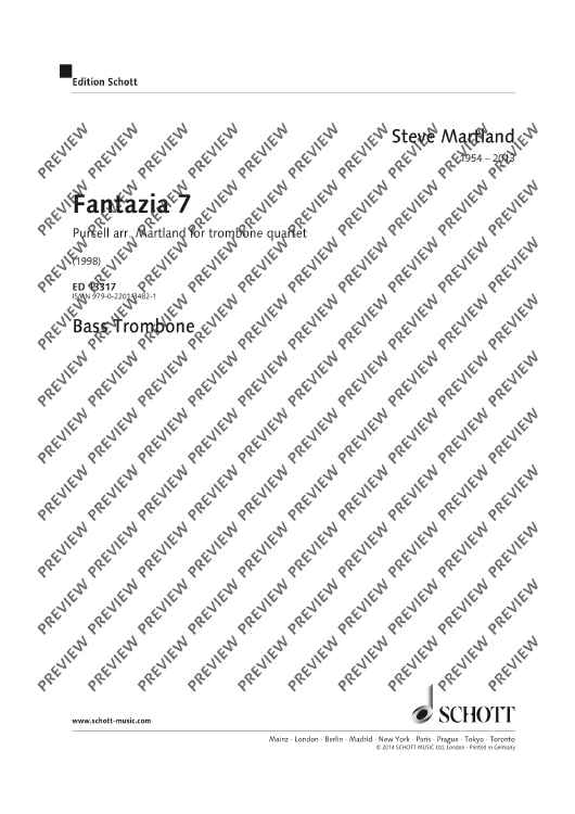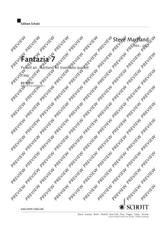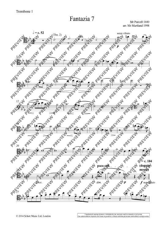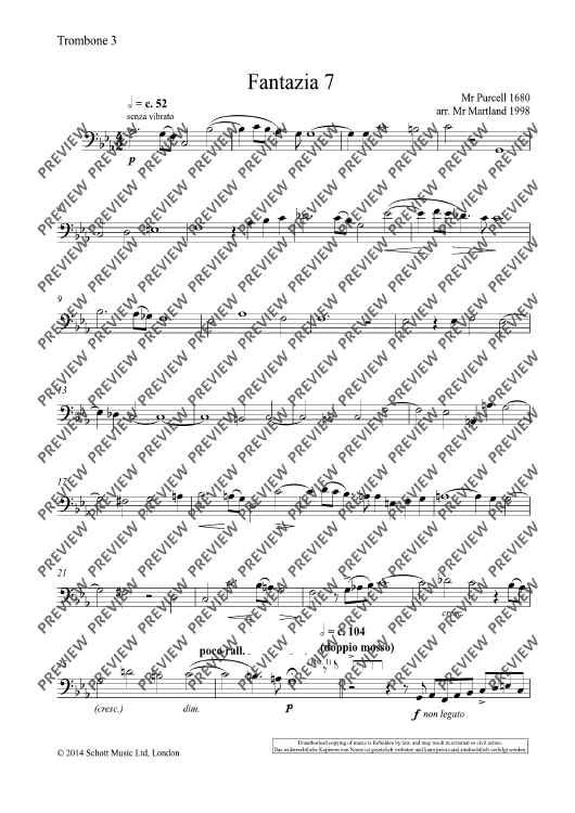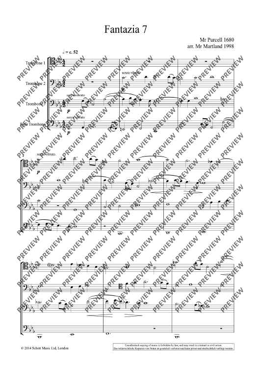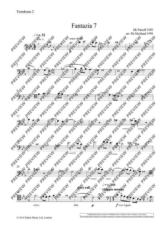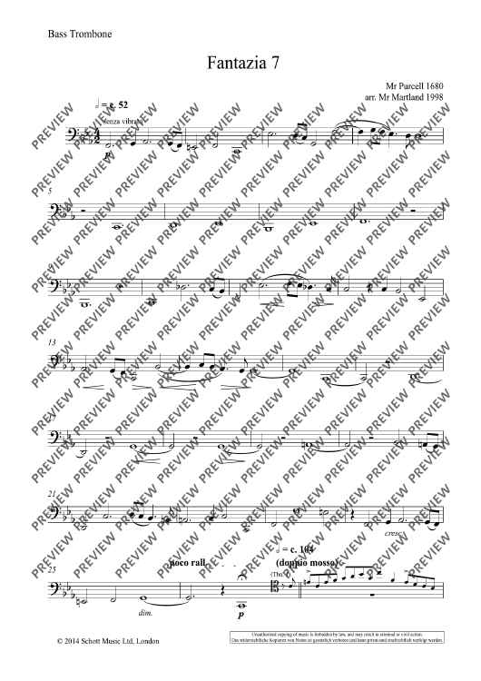Martland’s arrangements of Purcell’s music are wonderfully inventive and beautiful. Fantazia 7 for the unusual line up of trombone quartet is no exception and offers performers music that transports baroque music to the modern day.