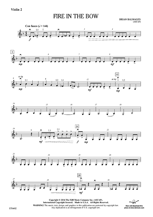 "Fire in the Bow - Violin 2" Sheet Music by Brian Balmages