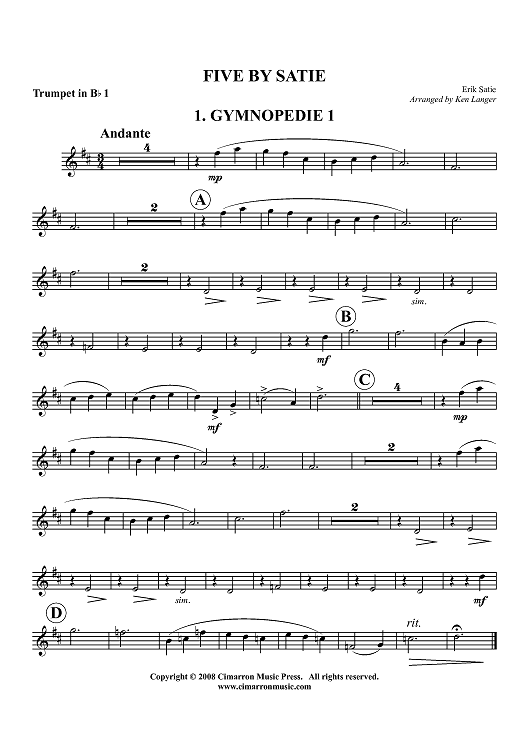 Digital Sheet Music for Five by Satie - Trumpet 1 in Bb by Erik Satie, Ken Langer scored for Brass Quintet; id:417470