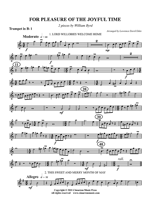 Digital Sheet Music for For Pleasure of the Joyful Time - Trumpet 1 in Bb by William Byrd, Lawrence David Eden scored for Brass Quintet; id:425003