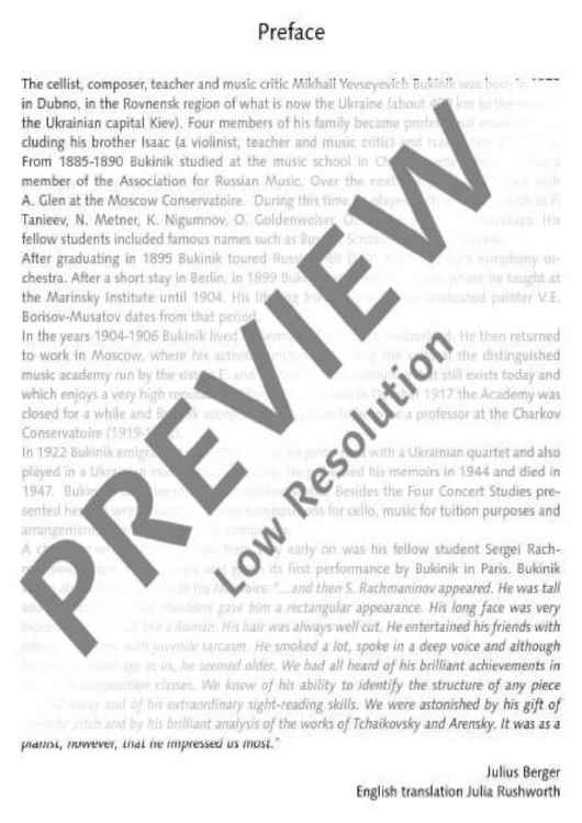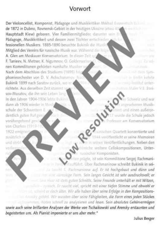 Fitting the violoncello like a glove, the concert études by the Russian composer Mikhail Bukinik (1872-1947) are also suited for concert performances. The études are compulsory pieces at the International Cello Competition in Markneukirchen in May 2005.