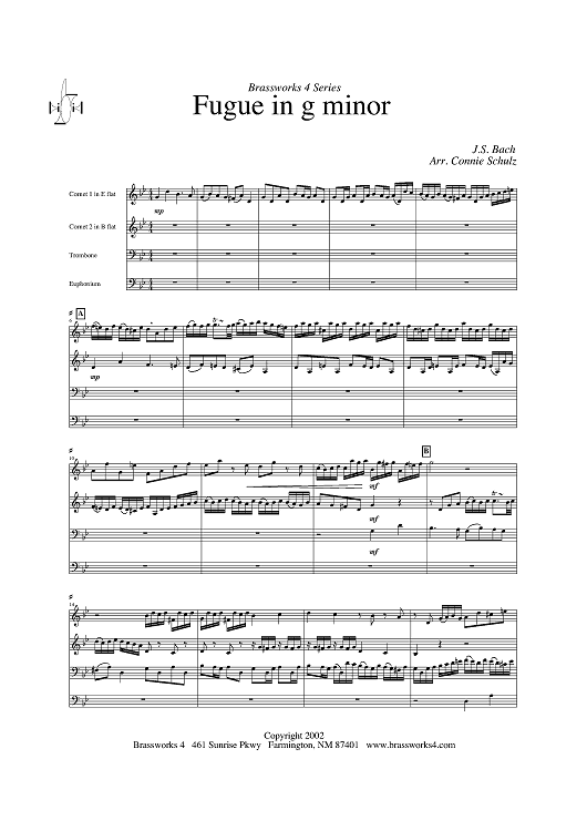 Digital Sheet Music for Fugue in G Minor - Score by Connie Schulz, Johann Sebastian Bach scored for Brass Quartet; id:316666