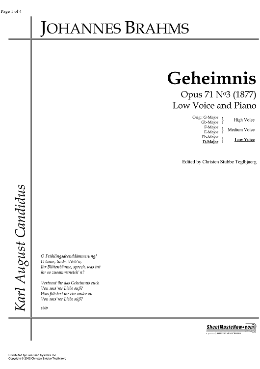 Digital Sheet Music for Geheimnis Op.71 No. 3 by , Johannes Brahms scored for Alto or Bass/Piano; id:336940