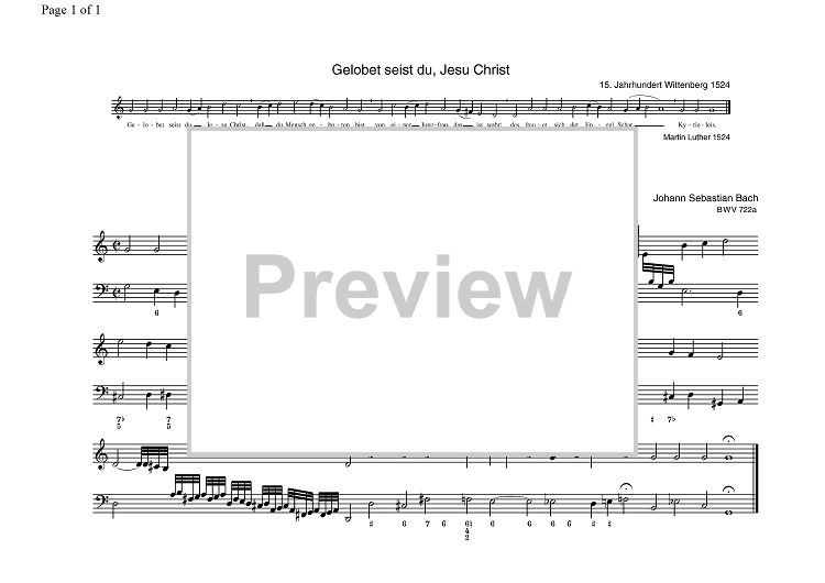 "Gelobet seist du, Jesu Christ BWV 722a" Sheet Music by Johann Sebastian Bach