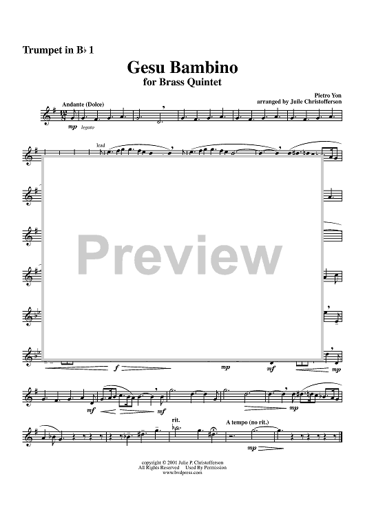 Digital Sheet Music for Gesu Bambino - Trumpet 1 by Pietro A. Yon, Julie Christofferson scored for Brass Quintet; id:314088