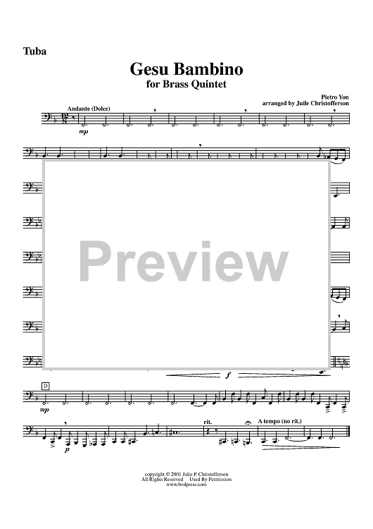 Digital Sheet Music for Gesu Bambino - Tuba by Pietro A. Yon, Julie Christofferson scored for Brass Quintet; id:314092