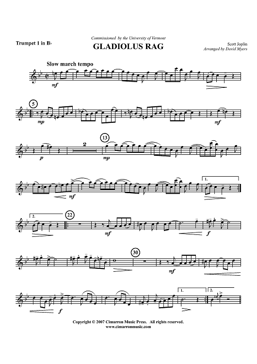 "Gladiolus Rag - Trumpet 1 in Bb" Sheet Music by Scott Joplin