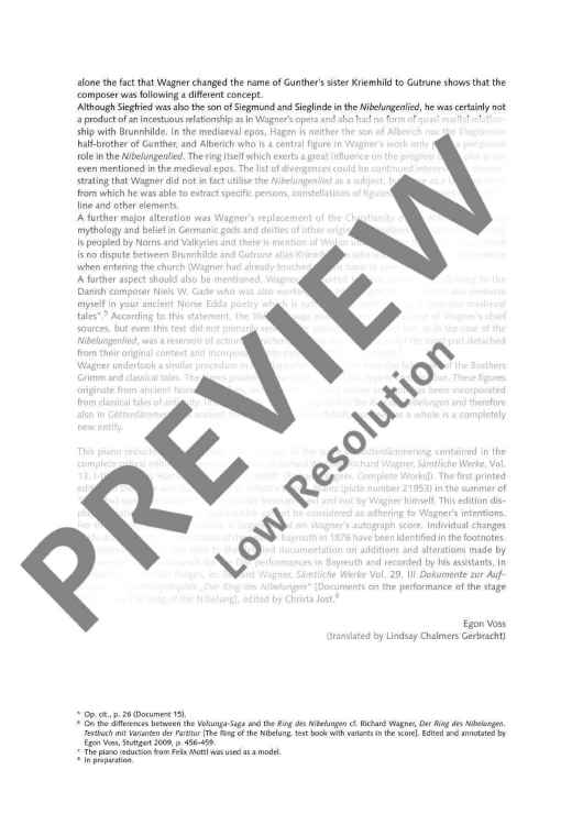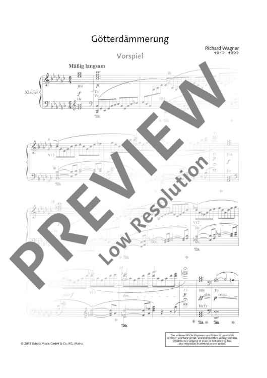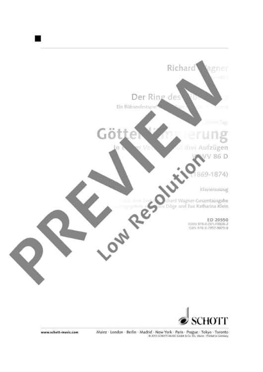 An important addition to the newly produced orchestral materials by Schott Music is the fi rst publication of vocal scores of Richard Wagner’s ten great operas in every important version. For the first time, we are able to offer theatres and interested opera-lovers vocal scores as urtext editions conceived following uniform editorial criteria: * The score corresponds to the performance materials from the Complete Edition. * For practical use in rehearsal and study, every vocal score includes rehearsal cues and bar numbers throughout. * The publisher has secured the services of renowned musicologists associated with the Richard Wagner Complete Edition who convey detailed information in critical forewords. * The forewords are given in three languages (German, English, French). * Uniform and attractive front cover designs with reproductions of paintings from the Wagner era underline the series design of the edition. GÖTTERDÄMMERUNG This piano reduction corresponds to the edition of the score of Götterdämmerung contained in the complete critical edition of the musical works of Richard Wagner (Richard Wagner, Sämtliche Werke, Vol. 13, I-III, edited by Hartmut Fladt, Mainz 1980ff. [Richard Wagner, Complete Works]). The first printed edition of the score was published by B. Schott’s Söhne, Mainz (plate number 21953) in the summer of 1876, but was supervised by the conductor Hermann Levi and not by Wagner himself. This edition displays deviations from the autograph which cannot be considered as adhering to Wagner’s intentions. For this reason, the critical edition is largely based on Wagner’s autograph score. Individual changes made during the first performances of the work in Bayreuth in 1876 have been identified in the footnotes.
