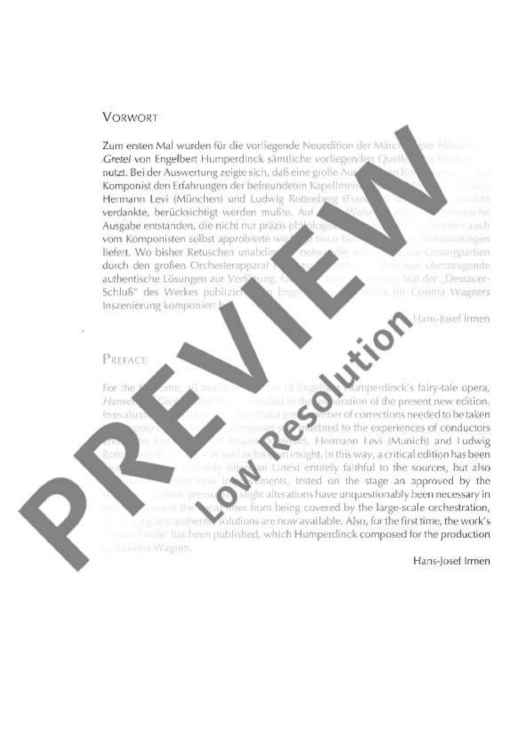 For the first time, all available sources of Engelbert Humperdinck's fairy-tale opera, Hansel und Gretel, have been consulted in the preparation of the present new edition. In evaluating them it became clear that a great number of corrections needed to be taken into account, for which the composer was indebted to the experiences of conductors known to him - Richard Strauss (Weimar), Hermann Levi (Munich) and Ludwig Rottenberg (Frankfurt) - as well as hiw own insight. In this way, a critical edition has been produced which not only offers an Urtext entirely faithful to the sources, but also provides important new improvements, tested on the stage an approved by the composer. Where, previously, slight alterations have unquestionably been necessary in order to prevent the vocal lines from being covered by the large-scale orchestration, convincing and authentic solutions are now available. Also, for the first time, the work's 'Desau-Finale' has been published, which Humperdinck composed for the production by Cosima Wagner. The edition is part of the ABRSM syllabus (grades 6,8).