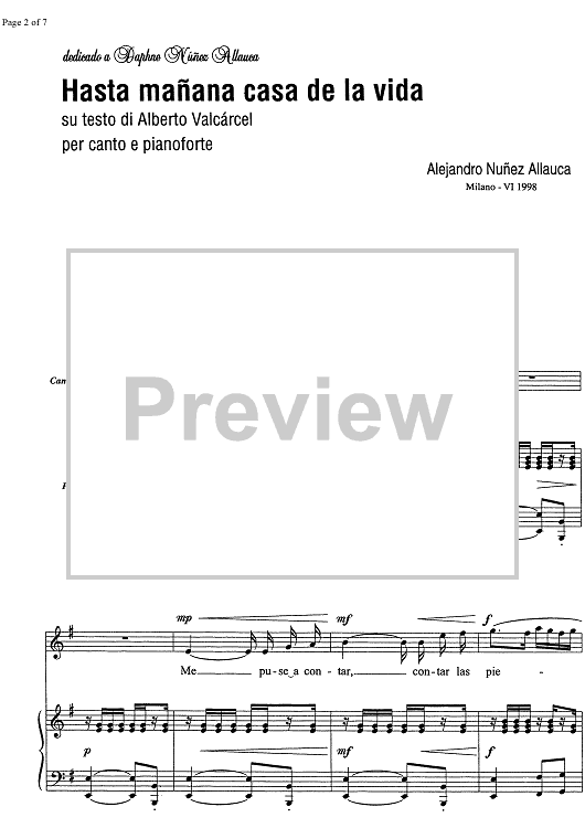 Digital Sheet Music for Hasta manana casa de la vida by Alejandro Núñez Allauca scored for Soprano or Tenor/Piano; id:334323