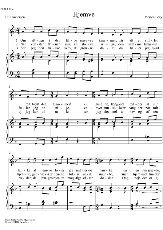 Digital Sheet Music for Hjemve by , Morten Levy scored for Soprano or Tenor/Piano; id:354241