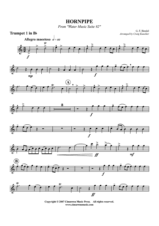 Digital Sheet Music for Hornpipe from "Water Music Suite #2" - Trumpet 1 in Bb by George Frideric Handel, Craig Kaucher scored for Brass Quartet; id:413904