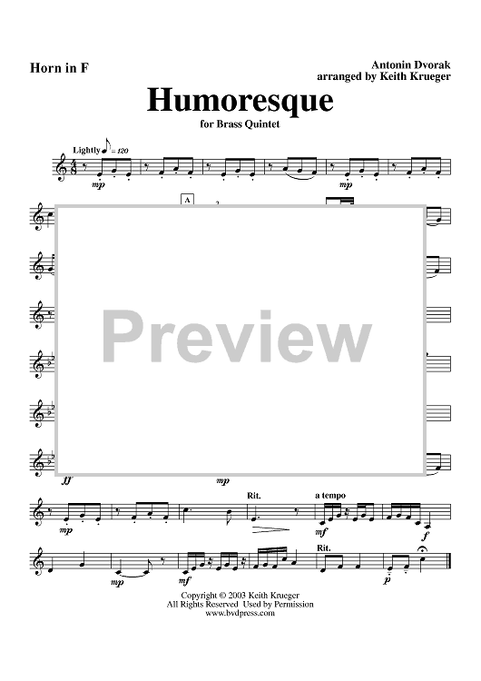 Digital Sheet Music for Humoresque - Horn by Antonín Dvorák, Keith Krueger scored for Brass Quintet; id:312900