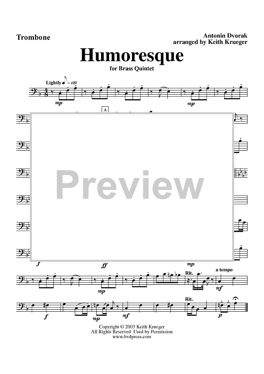 Digital Sheet Music for Humoresque - Trombone by Antonín Dvorák, Keith Krueger scored for Brass Quintet; id:312901