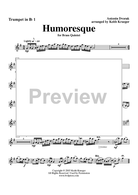 Digital Sheet Music for Humoresque - Trumpet 1 by Antonín Dvorák, Keith Krueger scored for Brass Quintet; id:312898
