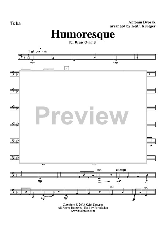 Digital Sheet Music for Humoresque - Tuba by Antonín Dvorák, Keith Krueger scored for Brass Quintet; id:312902