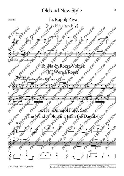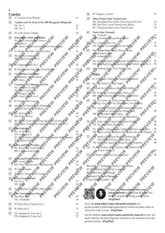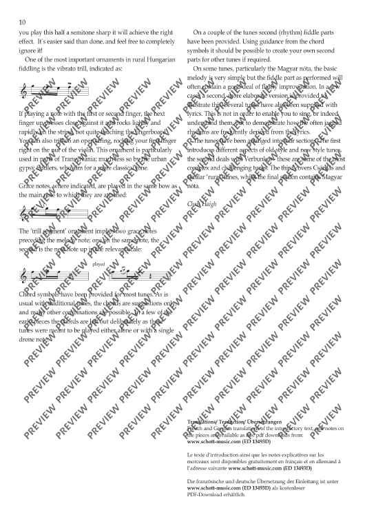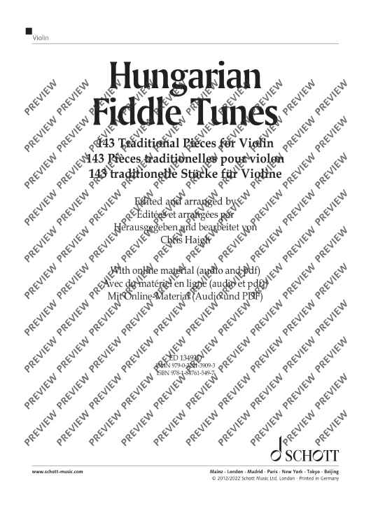 Hungarian Fiddle Tunes presents a collection of over 140 pieces for solo violin drawn from the rich tradition of Hungarian folk music.  With tunes covering a range of styles from Verbunkos, to Csárdás, to Magyar nóta, experienced folk fiddler Chris Haigh provides notes on all of the pieces, explaining technical aspects of the playing style.  The volume is accompanied by Audio files with a recording of all tunes performed by Chris which can be dowloaded with a voucher code printed in the book. German and French translations of all texts are available as free pdf downloads from the Schott Music website. Suitable for players of grades 3-8. Part of the best-selling World Music series, which also includes Fiddle music from England, Ireland, Scotland, Eastern Europe, America, Argentina, India, China and Korea.