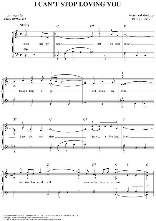 Digital Sheet Music for I Can't Stop Loving You by Don Gibson, John Brimhall scored for Easy Piano/Vocal; id:268618
