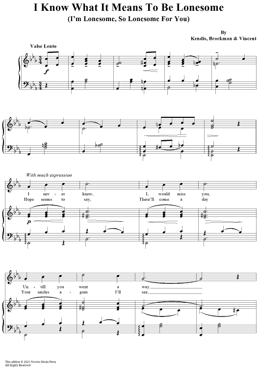 Digital Sheet Music for I Know What It Means to be Lonesome by Nat Vincent, James Kendis, James Brockman scored for Piano/Vocal; id:253836