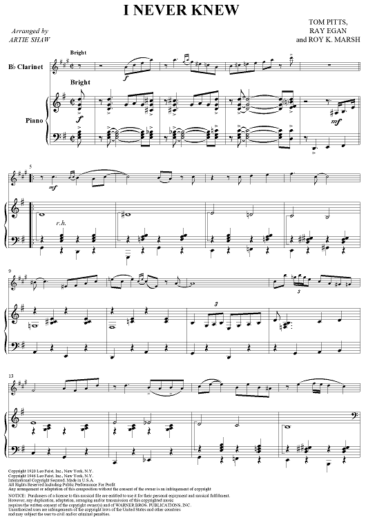 Digital Sheet Music for I Never Knew - Piano Score by Artie Shaw, Roy K. Marsh, Raymond B. Egan, Tom Pitts scored for Clarinet/Piano; id:355844