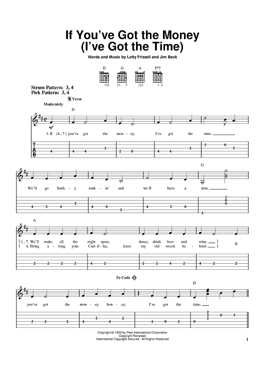Digital Sheet Music for If You've Got The Money (I've Got The Time) by Lefty Frizzell, Jim Beck, Willie Nelson scored for Easy Guitar Tab; id:393014