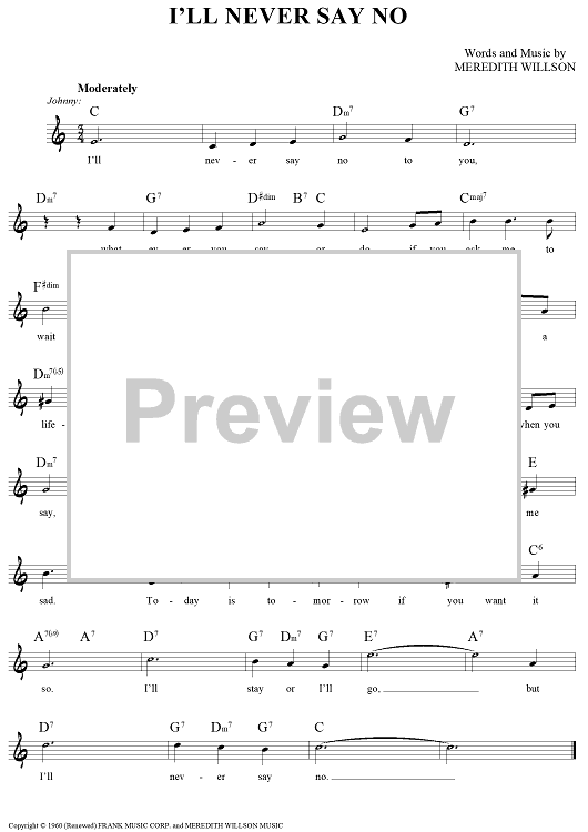 Digital Sheet Music for I'll Never Say No by Meredith Willson scored for Lead Sheet; id:460454