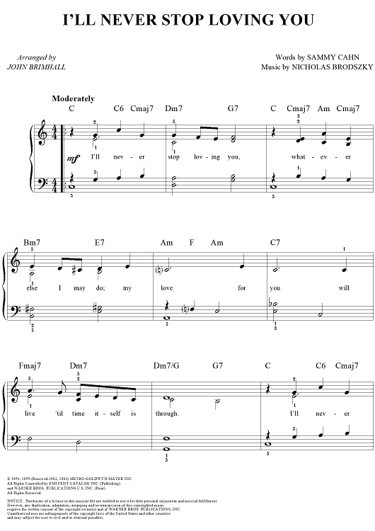 Digital Sheet Music for I'll Never Stop Loving You by Sammy Cahn, Nicholas Brodszky, John Brimhall scored for Easy Piano/Vocal; id:275007