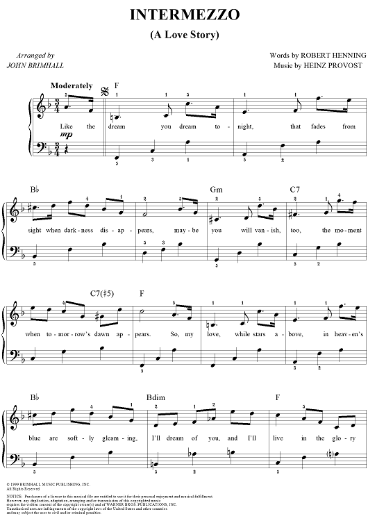 Digital Sheet Music for Intermezzo (A Love Story) by Heinz Provost, John Brimhall, Robert Henning scored for Easy Piano/Vocal; id:254846