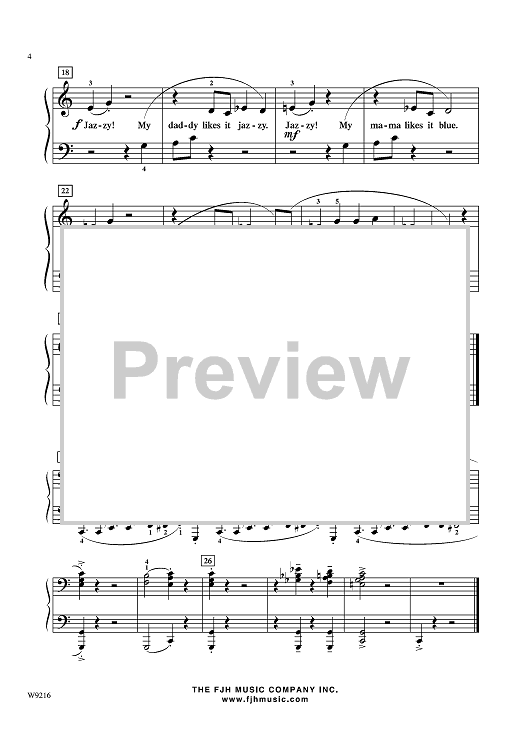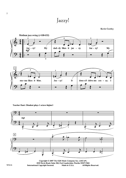 Teaching "swing" is easy with this middle C position piece, utilizing a "bluesy" flatted 3rd scale pattern that alternates with the major 3rd pattern. Fun lyrics about Dad and Mom provide an extra treat! The optional duet part contains a cool walking bass line and patterned chord