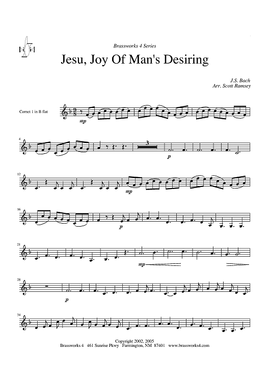 Digital Sheet Music for Jesu, Joy of Man's Desiring - Cornet 1/Trumpet 1 by Scott A. Ramsey, Johann Sebastian Bach scored for Brass Quartet; id:316688