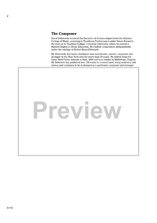 This inventive, lighter work features a catchy melody, clever rhythms and a wide array of engaging percussion parts. Certain to be a real audience pleaser and a fantastic change-of-pace on any program! (2:00)