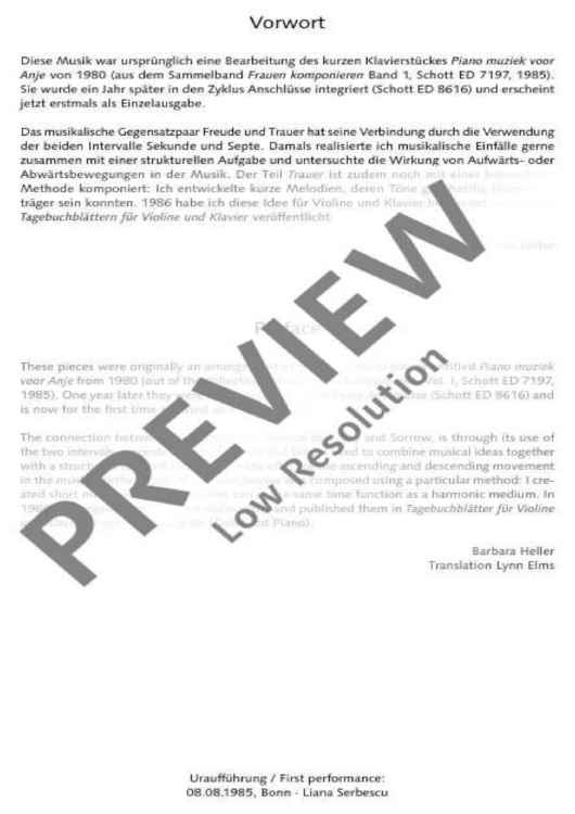 "Das musikalische Gegensatzpaar Freude und Trauer hat seine Verbindung durch die Verwendung der beiden Intervalle Sekunde und Septe. Damals realisierte ich musikalische Einfälle gerne zusammen mit einer strukturellen Aufgabe und untersuchte die Wirkung von Aufwärts- oder Abwärtsbewegungen in der Musik. Der Teil "Trauer" ist zudem noch mit einer besonderen Methode komponiert: ich entwickelte kurze Melodien, deren Töne gleichzeitig Harmonieträger sein konnten.“ (Barbara Heller)