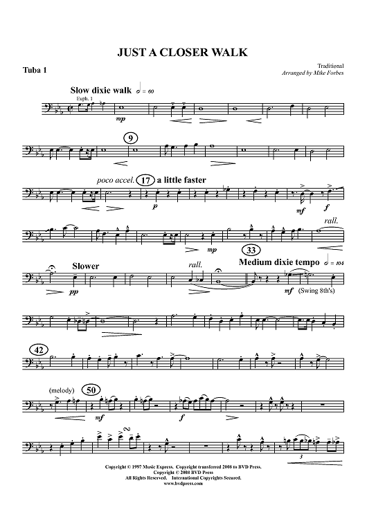 Digital Sheet Music for Just a Closer Walk - Tuba 1 by Traditional, Mike Forbes scored for Tuba Quartet; id:412014