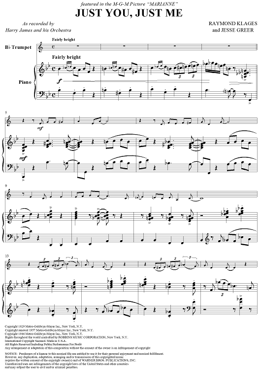 Digital Sheet Music for Just You, Just Me - Piano Score by Ray Klages, Jesse Greer, Harry James and His Orchestra scored for Trumpet/Piano; id:355833