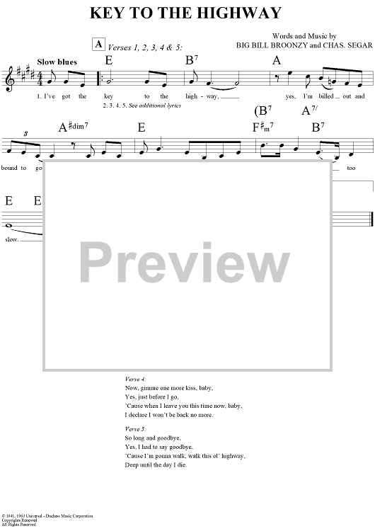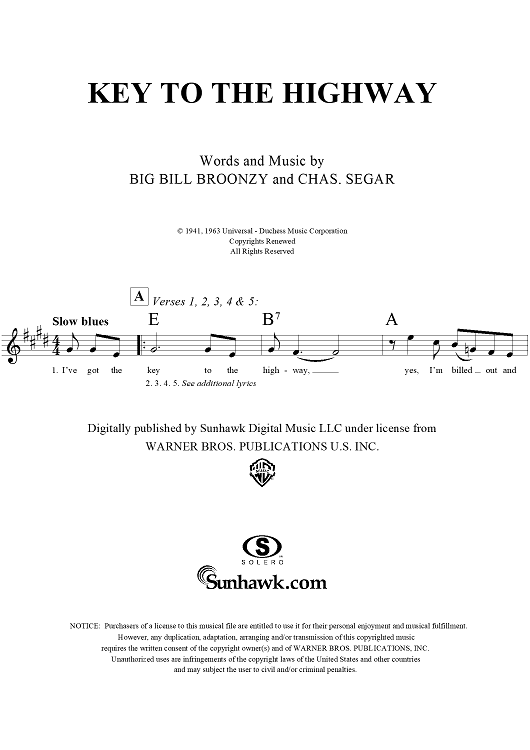 Digital Sheet Music for Key to the Highway by Big Bill Broonzy, Chas. Segar scored for Lead Sheet; id:291406