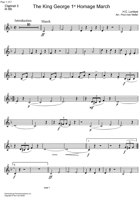 Digital Sheet Music for King George 1st Homage March - B-flat Clarinet 3 by Hans Lumbye, Poul Ivan Moller scored for Concert Band; id:328507