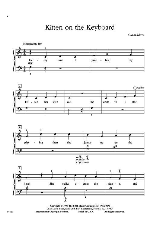 Fun and lighthearted, this piece accentuates playing in middle C and C positions. The clever lyrics about a kitten who loves to practice piano will surely inspire students to do the same!