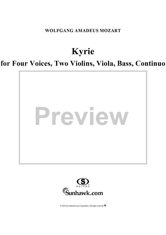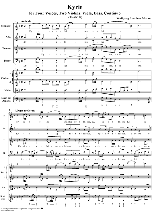 Digital Sheet Music for Kyrie for Four Voices, Two Violins, Viola, Bass, Continuo, K. 116 (K90a) - Full Score by Wolfgang Amadeus Mozart scored for Four-part Mixed Chorus; id:242015
