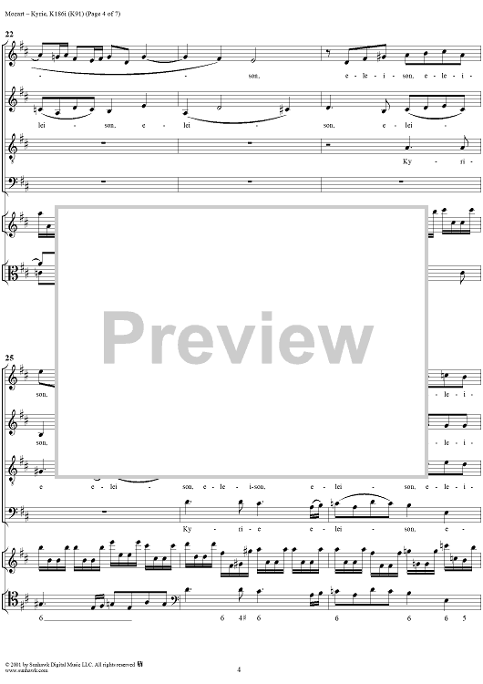 "Kyrie for Four Voices, Violin, Bass, Continuo, K. 91 (K186i) - Full Score" Sheet Music by Wolfgang Amadeus Mozart