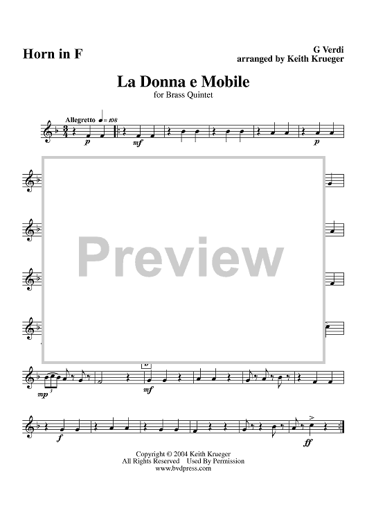 Digital Sheet Music for La Donna e Mobile - Horn by Giuseppe Verdi, Keith Krueger scored for Brass Quintet; id:312769
