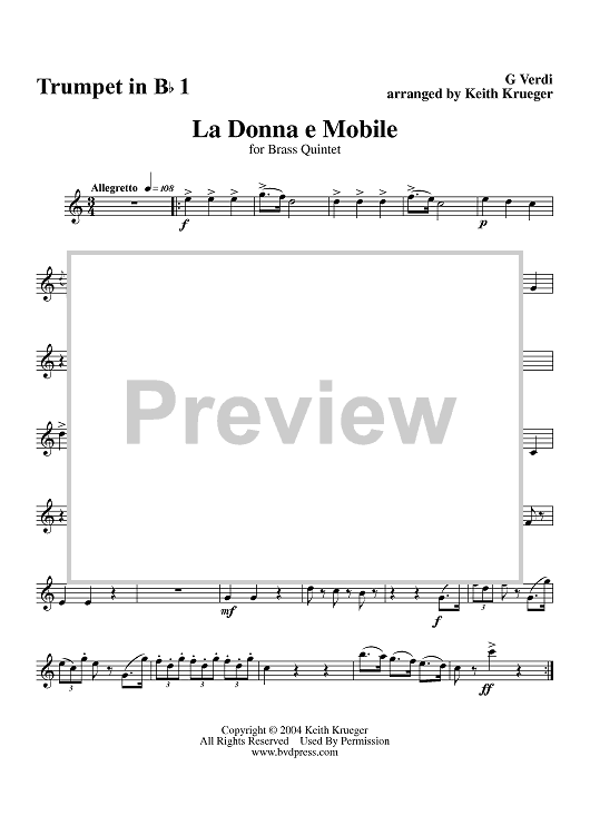 Digital Sheet Music for La Donna e Mobile - Trumpet 1 by Giuseppe Verdi, Keith Krueger scored for Brass Quintet; id:312767