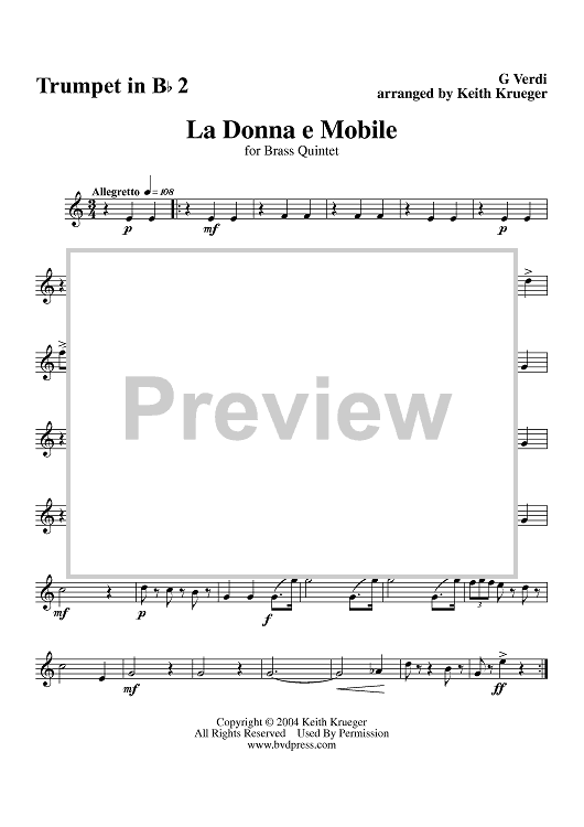 Digital Sheet Music for La Donna e Mobile - Trumpet 2 by Giuseppe Verdi, Keith Krueger scored for Brass Quintet; id:312768