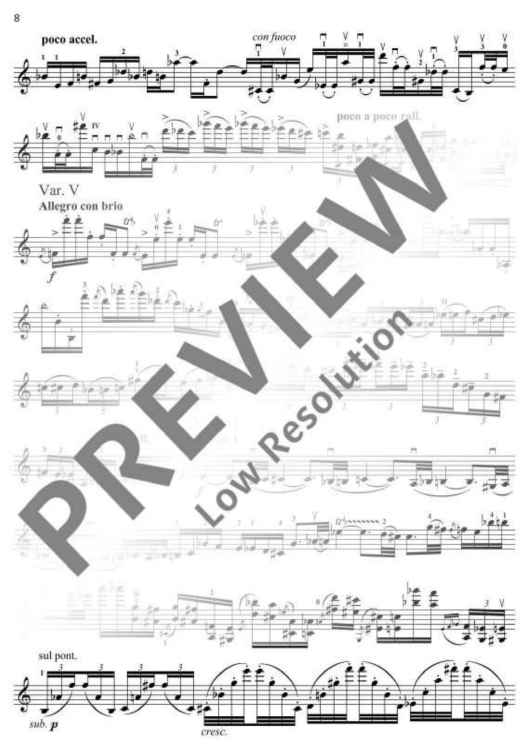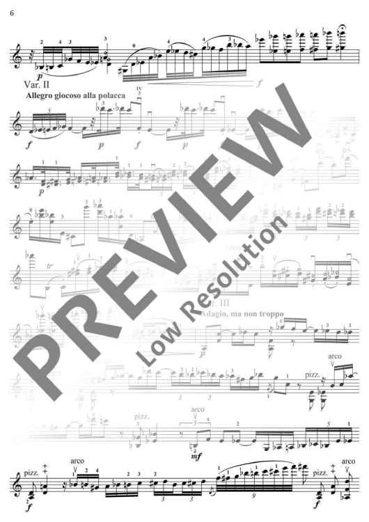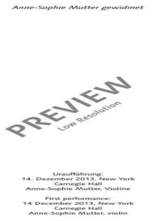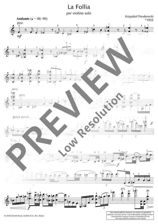 In his choice of the title La Follia, Krzysztof Penderecki recalls the tradition of virtuosic variations on a Sarabande originating from the Baroque period. The theme is introduced first in pizzicato, then arco, and is developed in nine variations which exploit the full range of playing techniques on the violin. The breakneck speed of double stopping passages, artificial harmonics, extensive melodic arcs, sparkling arpeggios over all four strings, flying spiccato, and broken chords above the ostinato theme make high musical and technical demands on the performer.