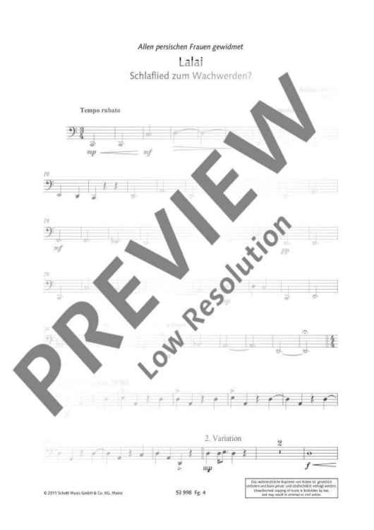 In this composition Barbara Heller uses the song Lalai created in Tehran in 1973. It is a song of resistance against the Shah regime and is about a mother who sings a lullaby to her child and tells the story of its father. Based on this song, Barbara Heller composed the duo 'Lalai, Schlaflied zum Wachwerden?' for violin (violoncello) and piano in 1989 - in memory of 50 Iranian women who were murdered under the regime of Khomeini. 'Lalai' is now available in a version for 4 bassoons for the first time. The composer has arranged the simple charming folk tune and the desperate cries for help for bassoon ensemble with a fine sense of detail. The sonorous sound of the bassoons gives the work its very own sound atmosphere. An impressive work of emotional depth.