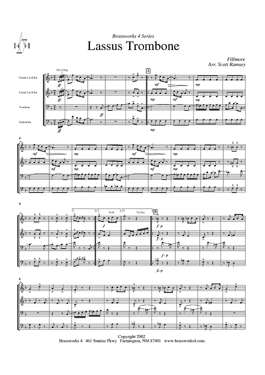 Digital Sheet Music for Lassus Trombone - Score by Henry Fillmore, Scott A. Ramsey scored for Brass Quartet; id:316708