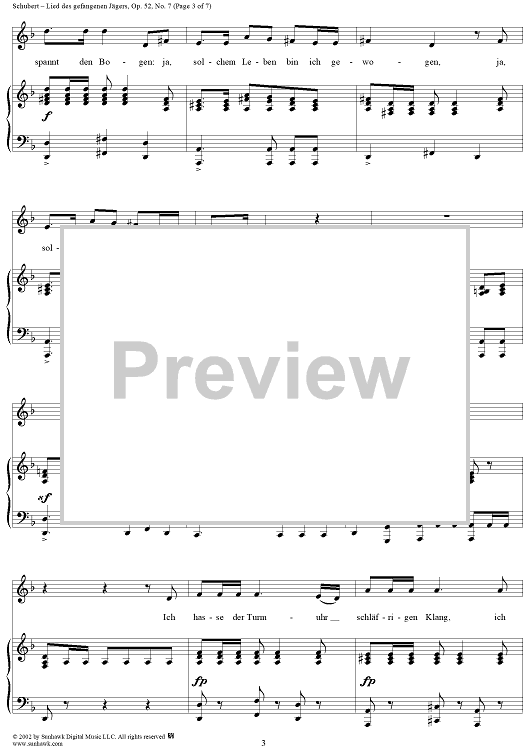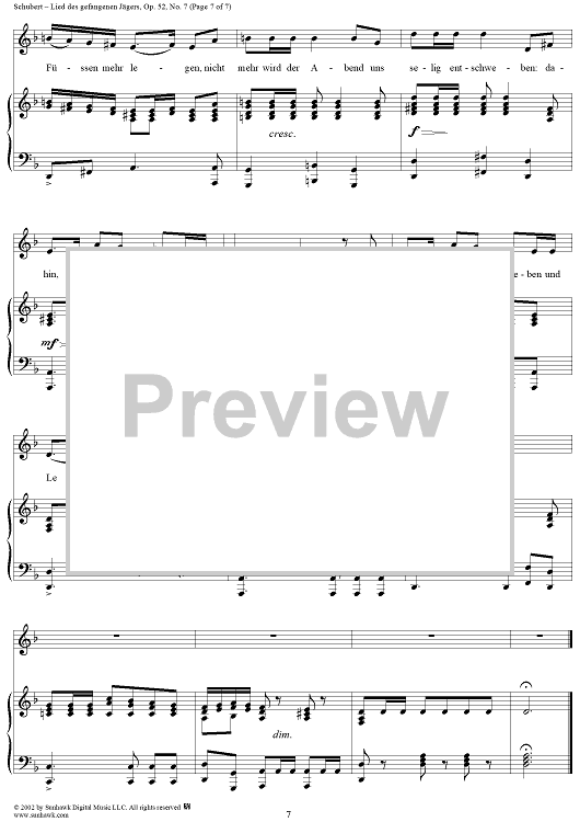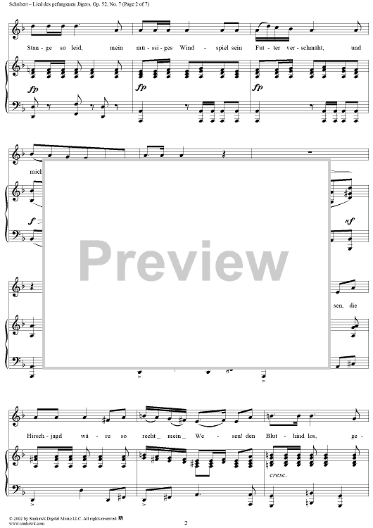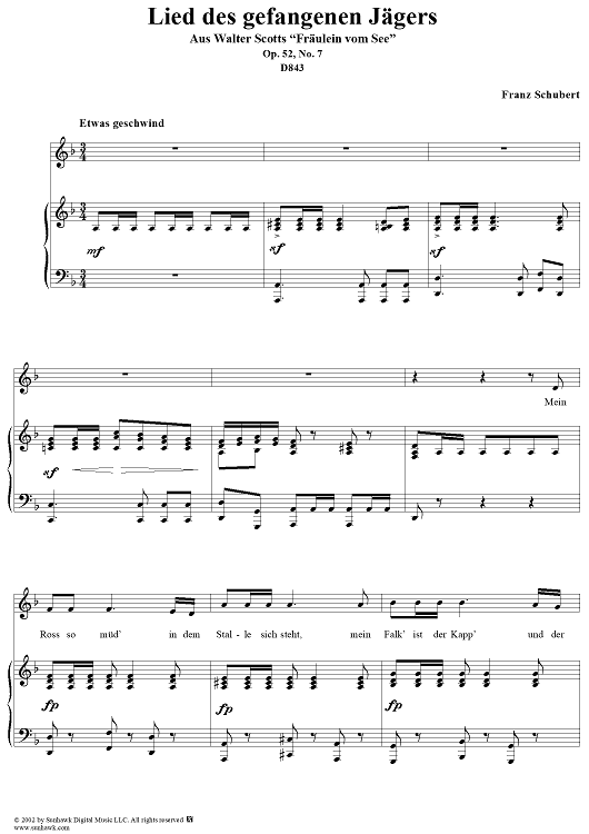 Digital Sheet Music for Lied des gefangenen Jägers, Op.52, No.7, D843 by Franz Schubert scored for Voice/Piano; id:256691